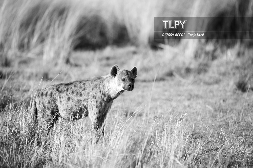 Eine Hyäne blickt in Richtung der Kamera schwarz-weiß